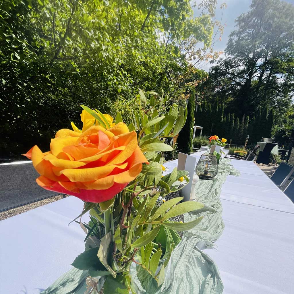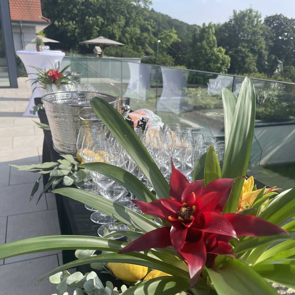 Bezüglich der Location bietet unser Standort in Eschborn einen besonderen Rahmen für Ihre Traumhochzeit. Modern und doch im Grünen können Sie bei uns in Eschborn feiern. Die Eventlocation befindet sich im obersten Stockwerk eines modernen Gebäudekomplexes und verfügt neben einer traumhaften Dachterrasse auch über einen hochwertig ausgestatteten Innenbereich mit Showküche. Wenn Sie wünschen, kümmern wir uns um alles rund um den perfekten Moment.